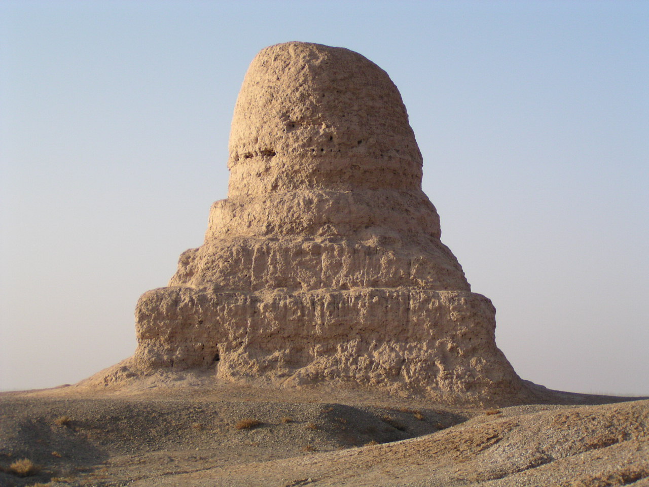 モーアールとは煙突の意味で、現在、中国最西に位置する仏教遺跡である。日干しレンガを積み上げた円錐形の仏塔は、かつては空洞でなかには仏像が安置されていた。激しい風化により当時の様子は分からないが、荒れた平坦な砂漠の一段と高い位置する仏塔からは周りを一望することができる。ガイドの話では、当時の様子について記載をしているものが少なくいったいどんな意味でこの仏塔が作られたのかあまりわかっていない謎の仏塔ということである。