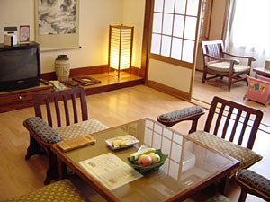 客室は……“なんちゃって日本旅館”というべきか。部屋の中にはフルーツと菓子の盛られた皿の置かれた低いテーブル、座椅子と肘置きが置かれ、床の間には山水画の掛け軸がある。障子の向こうには細長い部屋が隣接しており低めの椅子が二つ向かい合わせに置かれている。と、書けばいかにも温泉旅館風なのだが、畳ではなく床張りなのだ。そのため座椅子がよく滑り、座っていると、ずるずるとふんぞり返ってしまう。18時頃に露天風呂に入ってから部屋に戻ってみるとテーブルが片付けられ布団が敷かれていた。布団は薄く、床の固さが背中に伝わってきそうな感じである。