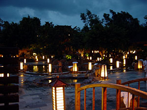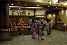 チェックイン時、露天風呂の入浴チケットと朝食券の他、KTVと屋上花火のチケットをもらったので、夕食の後KTVに行ってみた。もちろんゆかたである。チケットは無料とか割引とかいうものではなく、最低消費額が適用されなくなるというだけのものだった。店の広さに対して客が少なく、また数人の客がマイクを独占して延々とカラオケを歌い続けているのが少しわびしい。ちなみにいわゆるカラオケ小姐はいない。早々に退散し、花火チケットを手に握り屋上に行ってみる。チケットで交換してくれるのは高さ1メートルくらいに吹き上がるタイプの花火一本のみである。一応火をつけてみたが、すぐに終わってしまい、やはり少しわびしかった。