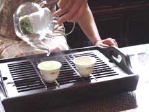 今回ご紹介するお茶は『苦丁茶』です。どのようなお茶でしょうか? 茶外の茶 ツバキ科の茶樹の葉ではないが、茶のようにして日常健康の為に飲むお茶をいいます。 今回は苦丁茶(kudingcha)をご紹介いたしましょう。木犀科の植物の新芽を摘み独特の方法で作られています。飲むと初めは苦く、やがて甘味が出てきます。効用は、血圧を下げる・のぼせをとる・消炎・解毒・ダイエットなど。 では、この苦丁茶を簡単に淹れる方法を教えて頂きましょう。