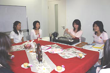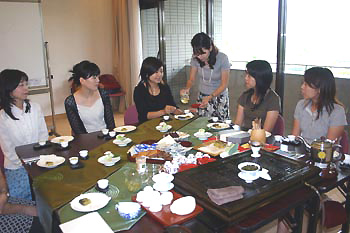 下記に注意して準備をしましょう。 ①空間:インテリア 基本色は2~3 色くらいに抑えて。 ②テーブルセッテイング:こちらも色の使いすぎに注意 ③生け花:香りのきつい花や花びらが落ちやすいものは避け、お互いの顔が隠れないように低めに生けましょう。 野に咲くように、風を感じるように生けてみましょう。 ④点心:お茶の発酵度にあわせてセレクトしましょう。ドライフルーツ、ナッツ系、季節のお菓子(仲秋の名月なら月餅)和菓子、洋菓子など。中国緑茶は甘みを楽しむため、甘い菓子との相性は難しいかもしれません。紅茶には洋菓子やチョコレートもぴったり。お菓子を頂くタイミングの規則はありません。おもてなしする側が随時お勧めしましょう。 ⑤音楽:アルフ・琴の中国古典楽器のCDを使って気軽に楽しみましょう。もちろん、生演奏なら最高です。 ⑥飾り:画・軸・飾りなど季節にあったものを。 ⑦お茶の種類:2~3品くらいを目安に。発酵度違いを楽しんで頂くのも良し、同種類のお茶を比べて楽しむのも良し。 ⑧時間:2時間くらいを想定。 ⑨器:お茶にあった器選び。 ⑩水:お茶にあった水選び。 ⑪お香をたく:お茶の香りを邪魔しない程度の控えな香りで。 ⑫テーマ:お茶会の目的を考える。(送別茶会・暑気払い茶会・緑茶会など自由に) ⑬注意する話題:政治や宗教の話は避けましょう。 ■2007年6月 上海浦東 中国茶会 テーマ:苺美さん送別茶会