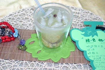 | 西湖ロンジン茶をソーダー水で割り、巨峰とドライミックスフルーツを数種類ブレンド。とても、さわやかな一品です。氷は中国で縁起の良いとされる魚の形・・細かいところまでこだわりがある作品です。 |